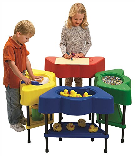 Includes lower shelf and lid. Sturdy, adjustable stands. Adult supervision recommended. Not recommended for water use. Age recommended: 3 years and above. Green guard certified for children and schools. Adjustable from 16 in. to 24 in. H. Warranty: 5 year. Made from steel. Minimal assembly required. 12 in. W x 24 in. H (15 lbs.). Can be used with sand, toys or whatever can be imagined. Fun shaped can be configured in a row or circle for community play or used individually.SENSORY TABLES: Fun shaped sensory tables can be configured in a row for individual play or a circle for community play