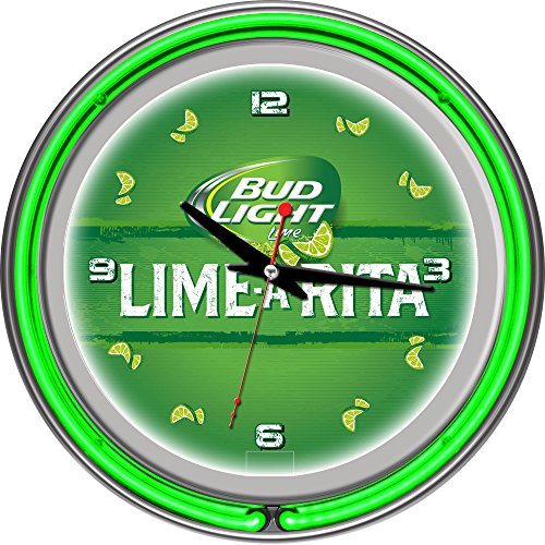 Every game room, garage or man cave could use the addition of an officially licensed Bud Light Lime A Rita neon clock. So why not add one of the highest grade clocks on the market to your collection? This impressive clock has not just one but two neon rings. It has an accent colored neon ring on the exterior and a brilliant white neon ring on the interior of the clock to light up your favorite logo. Other highlights include chrome finished resin housing and a high grade glass clock face cover. The battery operated quartz clock mechanism will keep your new prize precise and ticking for a long time, while the neon runs off the included AC adapter. The neon is controlled by the pull chain and the back of the clock includes a wall hanging mount. The 3 inch depth of this clock combined with the radiant shimmer of the neon reflecting off the chrome housing is sure to make this clock pop off of any wall. Bring style and function to your game room, garage or collection with an officially licensed neon clock.AC Power Adapter with 6 ft. Cord, Wall Hanging Mount